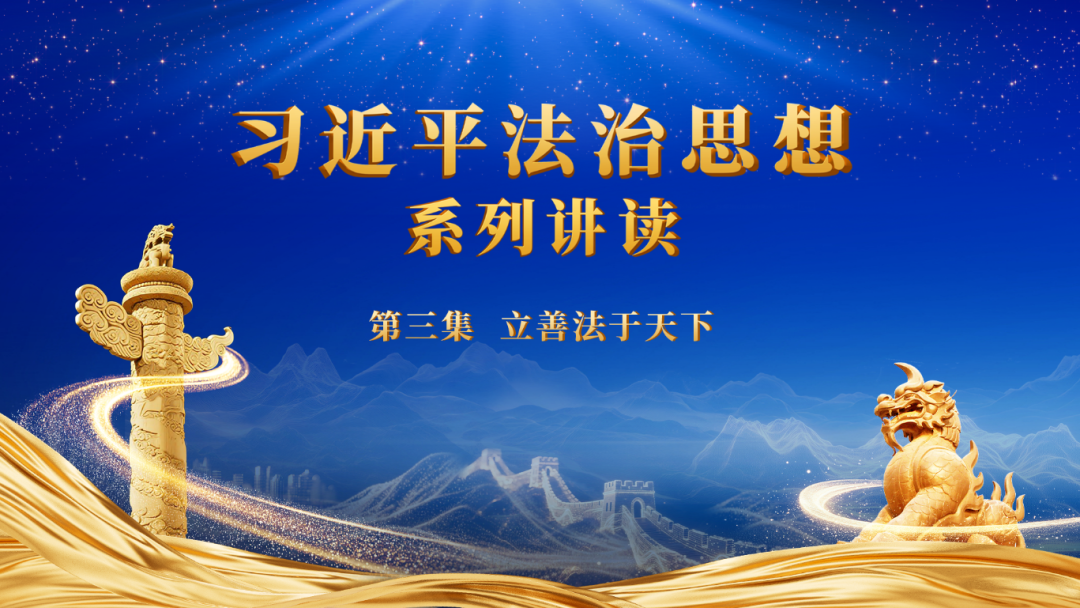 为深入贯彻落实习近平法治思想,中央广播电视总台联合中央政法委、中央依法治国办、中国法学会共同制作推出8集大型专题节目《习近平法治思想系列讲读》。2026年1月23日20:04,中央广播电视总台央视综合频道(CCTV-1)将播出该节目的第三集《立善法于天下》,社会与法频道(CCTV-12)次日20:07重播,央视网、央视频、央视新闻同步播出。