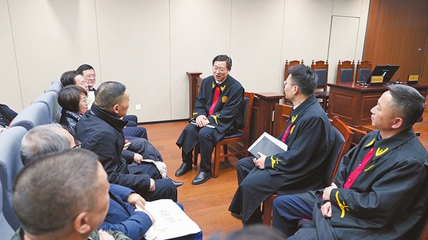 图为采风作家们在合肥法务区旁听庭审后,与主审法官交流。见习记者 毛熙之 摄