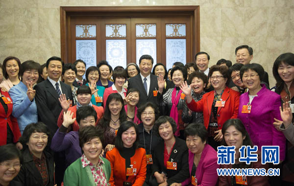 3月8日,中共中央总书记、中共中央军委主席习近平参加十二届全国人大一次会议江苏代表团审议。这是习近平同女代表合影,并代表党中央向出席两会的女代表、女委员,向全国各族各界妇女致以节日的祝贺。新华社记者 兰红光 摄