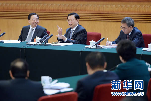 3月8日,中共中央政治局常委、国务院副总理张德江参加十二届全国人大一次会议广东代表团的审议。 新华社记者 李涛 摄