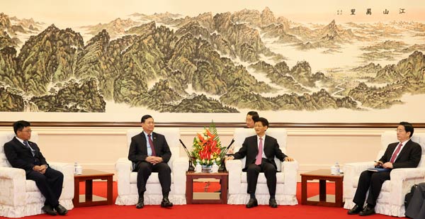 11月14日,孟建柱郭声琨在北京会见来华参加中缅第四次执法安全合作部长级会议的缅甸内政部部长哥哥。郝帆 摄
