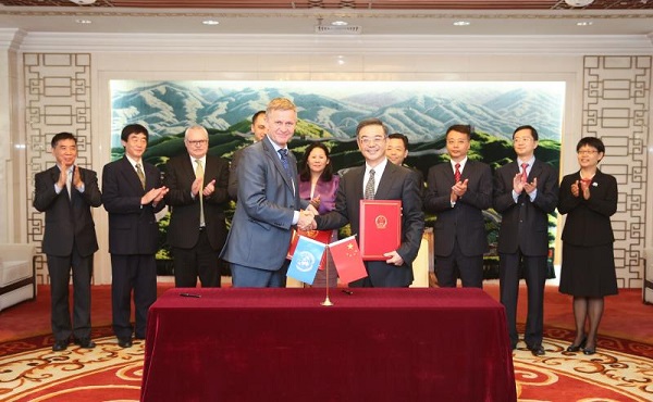 图为 周强与埃里克•索尔海姆共同签署《中华人民共和国最高人民法院与联合国环境规划署谅解备忘录》。孙若丰 摄