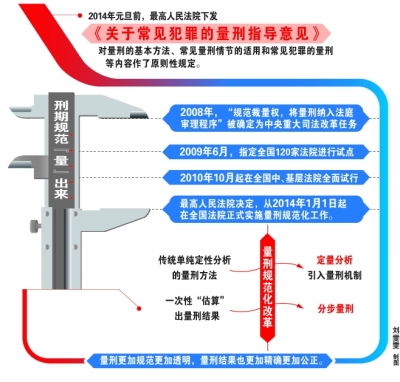 2014年元旦前,最高人民法院下发《关于常见犯罪的量刑指导意见》,对量刑的基本方法、常见量刑情节的适用和常见犯罪的量刑等内容作了原则性规定。