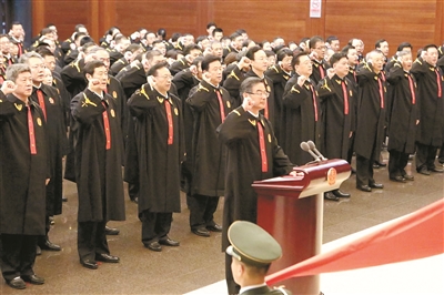 2017年7月3日,中华人民共和国首席大法官、最高人民法院院长周强面向国旗,带领首批入额法官进行入额宣誓。