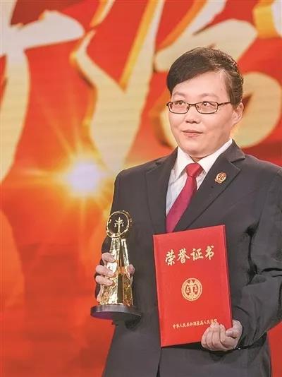 图为钱继红在“我最喜爱的好法官”推选结果揭晓活动上接受荣誉证书及奖杯。