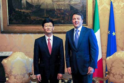 图为孟建柱在罗马会见意大利总理伦齐。新华社记者 许逆之 摄