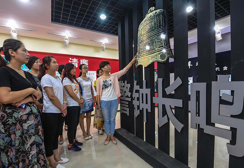 2017年10月18日上午,举世瞩目的中国共产党第十九次全国代表大会在北京隆重开幕。2200多名党代表以意气风发的精神状态和一往无前的奋斗姿态展现在世人面前,展示出一个百年大党浴火再塑后的崭新形象。征服一座高峰,需要超越的是自我。党的十八大以来,以习近平同志为核心的党中央带领中国共产党以无私的斗争精神,开启了一场自我革命、自我再塑的伟大工程。铁腕反腐、凝心聚魂、正风肃纪、坚毅担当……重锤之下,火花四射。一个个动人心魄的瞬间,汇聚成壮丽夺目的长卷,在革命性锻造中,新时代党的面貌发生了前所未有的变化。2017年6月25日,河北省枣强县干部家属参观廉政教育基地。新华社记者李晓果摄