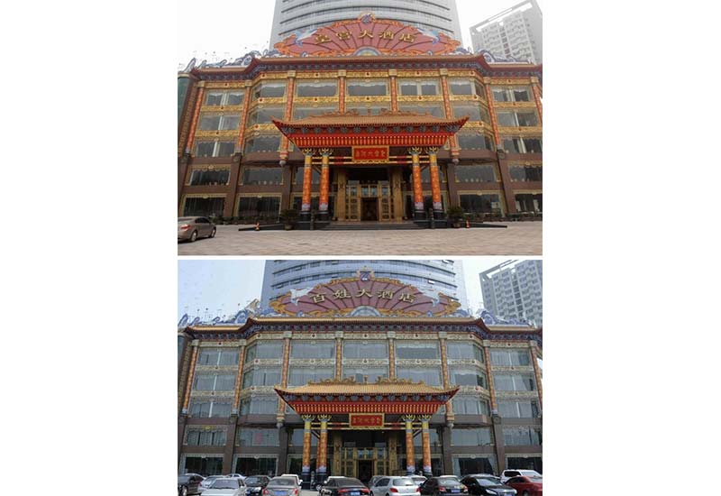 上图为2011年拍摄的石家庄皇宫大酒店;下图为石家庄“皇宫大酒店”的巨幅招牌换成了“百姓大酒店”(2014年4月29日摄)(拼版照片)。新华社记者王晓摄