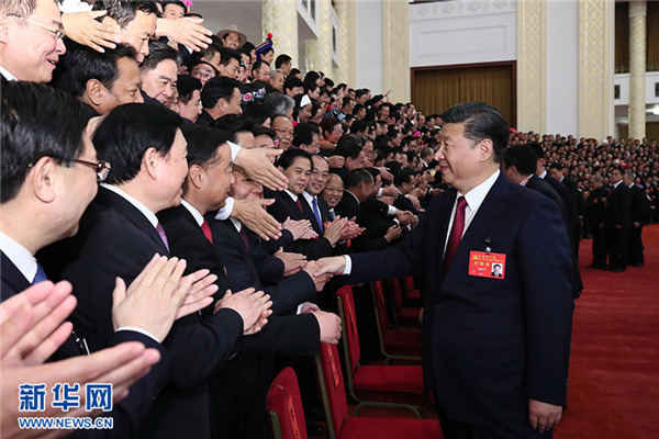 10月25日下午,中共中央总书记、国家主席、中央军委主席习近平等领导同志在北京人民大会堂亲切会见出席党的十九大代表、特邀代表和列席人员。新华社记者 鞠鹏 摄