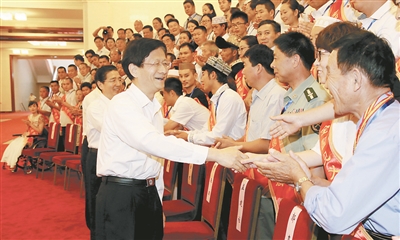 7月25日,第十二届全国见义勇为英雄模范表彰大会在人民大会堂召开。会前,中共中央政治局委员、中央政法委书记孟建柱会见了见义勇为英雄模范代表。 郝 帆 摄