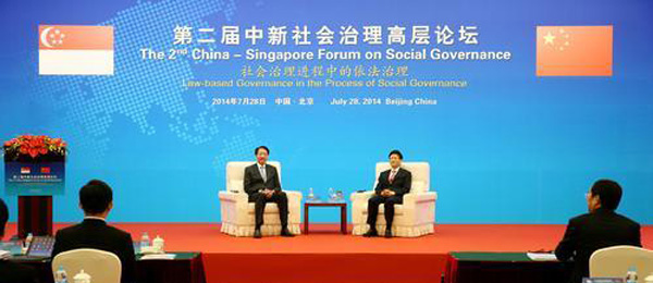 第二届中新社会治理高层论坛28日在京举行。中共中央政治局委员、中央政法委书记、中央综治委主任孟建柱,新加坡副总理兼国家安全统筹部长及内政部长张志贤出席开幕式并发表主旨讲话。