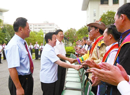 最高人民法院院长王胜俊、云南省委书记白恩培在云南高院院长许前飞的陪同下,接见云南优秀少数民族法官。(刘学斌 徐雁 摄)