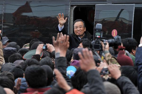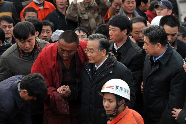 4月15日下午,中共中央政治局常委、国务院总理温家宝飞抵青海玉树地震灾区,考察灾情,慰问各族干部群众,指导抗震救灾工作。他指出,当前,抗震救灾第一位的工作是救人。只要有一丝希望,就要尽百分努力,坚持下去,决不放弃。
