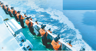 图⑤:4月18日,中越海警举行2017年首次北部湾共同渔区海上联合检查,中国海警3301舰的舰员分区列队。