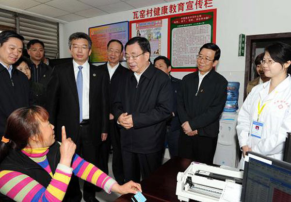 4月16日,贺国强在成都双流县兴隆镇瓦窑村考察新农村建设。4月13日至16日,中共中央政治局常委、中央纪委书记贺国强在四川考察。新华社记者 饶爱民 摄