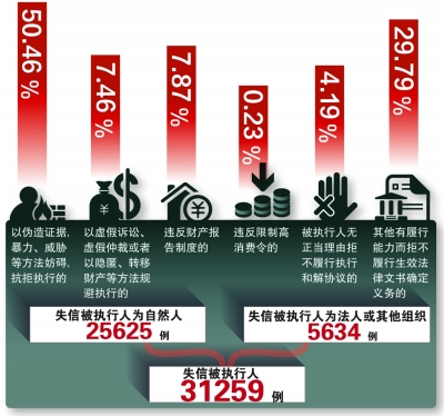 这些名单信息,均系各地法院根据《最高人民法院关于公布失信被执行人名单信息的若干规定》(以下简称《规定》)设定的条件、标准,通过法定程序,依职权作出认定,统一录入到名单库。31259例信息当中,失信被执行人为自然人的有25625例,法人或其他组织的有5634例。其中,以伪造证据、暴力、威胁等方法妨碍、抗拒执行的占全部信息的50.46%;以虚假诉讼、虚假仲裁或者以隐匿、转移财产等方法规避执行的占7.46%;违反财产报告制度的占7.87%;违反限制高消费令的占0.23%;被执行人无正当理由拒不履行执行和解协议的占4.19%;其他有履行能力而拒不履行生效法律文书确定义务的占29.79%。