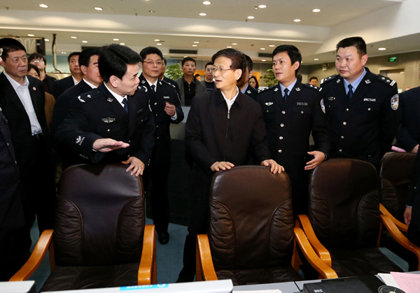 3月24日至27日,中共中央政治局委员、中央政法委书记孟建柱来到广东汕头、深圳调研。图为孟建柱在汕头市公安局指挥中心调研。(摄影 郝帆)
