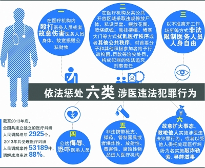 《意见》规定,六类涉医违法犯罪行为,必须准确适用法律,依法惩处:一是依法惩处在医疗机构内殴打医务人员或者故意伤害医务人员身体、故意损毁公私财物的行为;二是依法惩处在医疗机构及其公共开放区域采取违规停放尸体、私设灵堂、摆放花圈、焚烧纸钱、悬挂横幅、堵塞大门等方式扰乱医疗秩序或者其他公共秩序的行为,对首要分子和其他积极参加者给予行政拘留、罚款等治安处罚,构成犯罪的依法追究刑事责任;三是依法惩处以不准离开工作场所等方式非法限制医务人员人身自由的行为;四是依法惩处公然侮辱、恐吓医务人员的行为;五是依法惩处非法携带枪支、弹药、管制器具或者爆炸性、放射性、毒害性、腐蚀性物品进入医疗机构的行为;六是依法惩处故意扩大事态、教唆他人实施涉医违法犯罪行为,或者以受他人委托处理医疗纠纷为名实施敲诈勒索、寻衅滋事等行为。