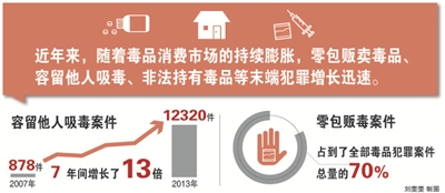 马岩在回答记者提问时说,近年来,随着毒品消费市场的持续膨胀,零包贩卖毒品、容留他人吸毒、非法持有毒品等末端犯罪增长迅速,例如容留他人吸毒案件从2007年的878件增加到2013年的12320件,7年间增长了13倍,零包贩毒案件也占到了全部毒品犯罪案件总量的70%左右。针对这种严峻形势,人民法院今后将更加注重对引诱、教唆、欺骗、强迫、容留他人吸食毒品等末端毒品犯罪的处罚力度,以遏制毒品供应,减少毒品需求。