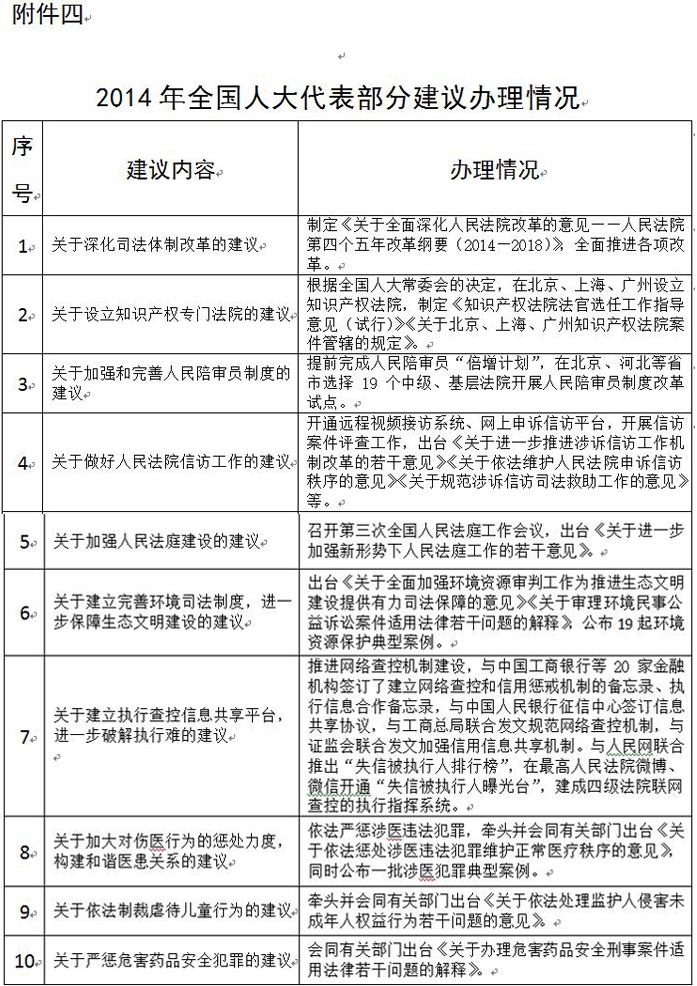 附件四:2014年全国人大代表部分建议办理情况