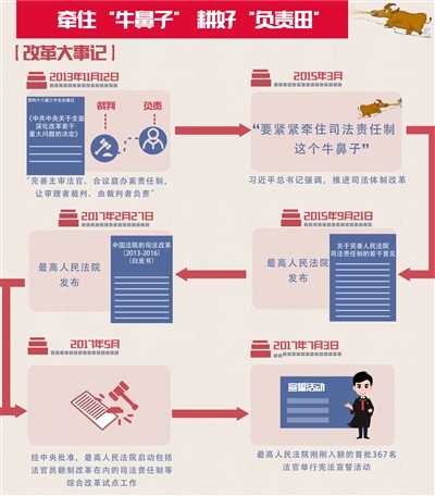 2015年3月,在十八届中共中央政治局第二十一次集体学习时,习近平总书记强调,推进司法体制改革,“要紧紧牵住司法责任制这个牛鼻子”。这一形象的比喻,突出了司法责任制改革在整个司法体制改革中的地位和重要作用。