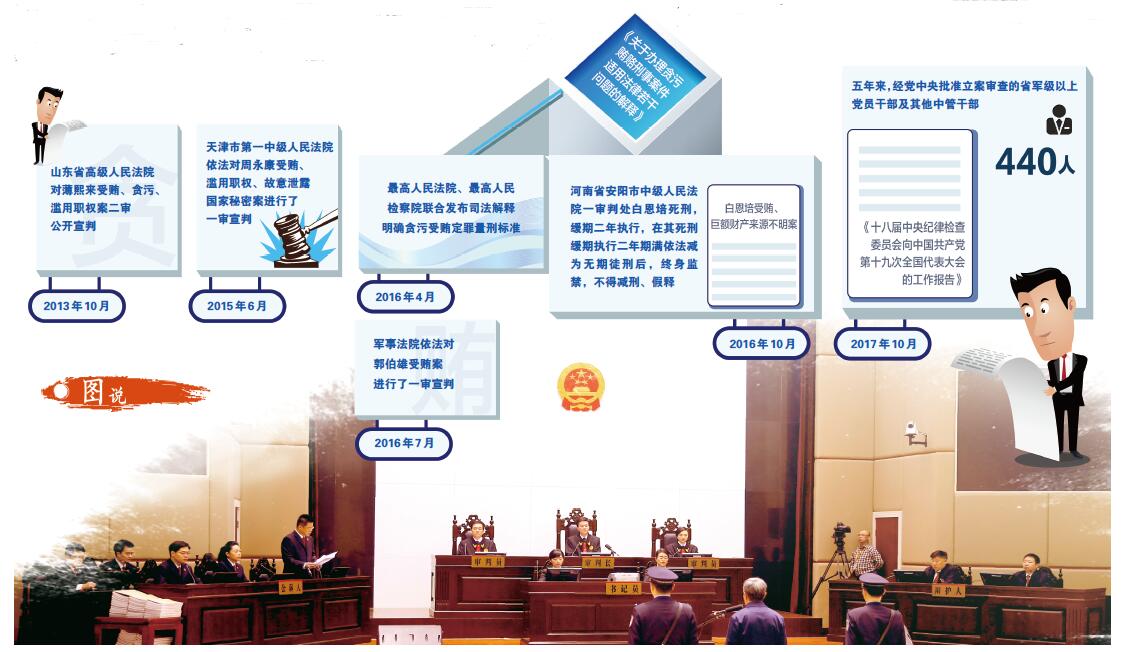 五年来,党中央重拳反腐的决心勇气、惩贪去恶的雷霆之势,一次次刷新了人们的认识。《十八届中央纪律检查委员会向中国共产党第十九次全国代表大会的工作报告》显示,五年来,经党中央批准立案审查的省军级以上党员干部及其他中管干部440人。