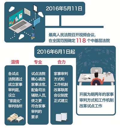2016年5月11日,最高人民法院召开视频会议,宣布在全国范围确定118个中基层法院,自2016年6月1日起开展为期两年的家事审判方式和工作机制改革试点工作。