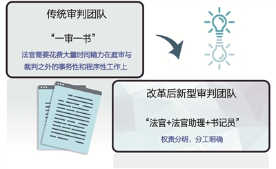 多年来,在传统的“一审一书”办案模式下,法官需要花费大量时间精力在庭审与裁判之外的事务性和程序性工作上。将法官从中解放出来,把精力集中于“审”和“判”上,是司法改革聚焦的核心问题之一。改革后的新型审判团队,普遍由“法官+法官助理+书记员”组成审判单元,权责分明,分工明确。