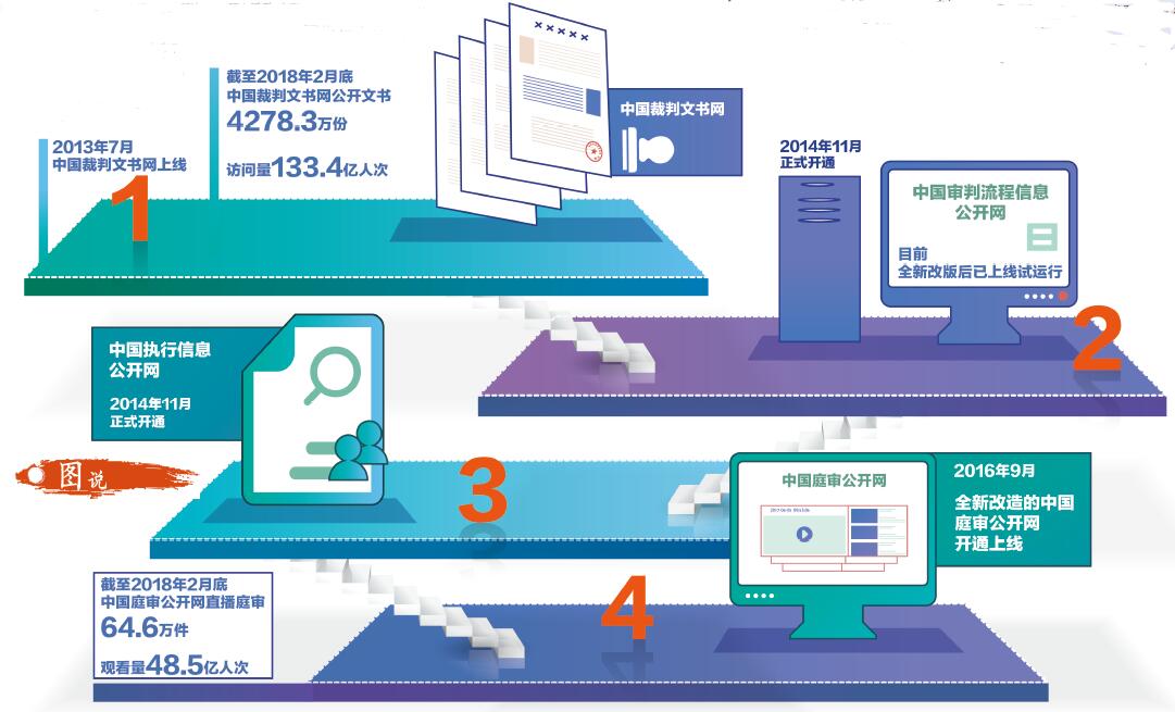 中国裁判文书网、中国审判流程信息公开网、中国执行信息公开网、中国庭审公开网……落实习近平总书记的指示,人民法院全力推进司法公开工作,随着四大平台的陆续建成运行,司法案件从立案、审判到执行,全部重要流程节点实现信息化、可视化、公开化,构建出了开放、动态、透明、便民的阳光司法机制。
