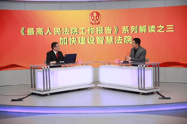 崔志刚:各位观众,大家下午好!我是崔志刚。这里是由最高人民法院新闻局主办的《最高人民法院工作报告》系列解读全媒体直播访谈活动现场,此次直播活动共有5场,将围绕最高人民法院工作报告的重点内容,全方位、立体化、深层次向社会展示人民法院的工作亮点和成果。今天是系列直播活动的第3场,加快建设智慧法院,我们现在在最高人民法院的全媒体新闻发布厅进行直播。