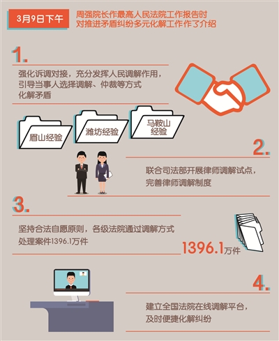3月9日下午,十三届全国人大一次会议召开第二次全体会议,周强院长作最高人民法院工作报告时,对推进矛盾纠纷多元化解工作作了介绍——