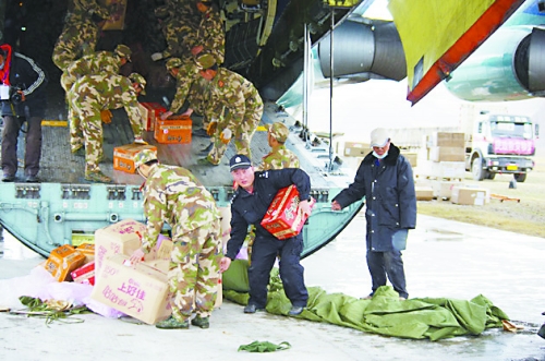 4月22日,玉树州中院干警和武警官兵一起在巴塘机场接收救援物资。曲塔才仁摄