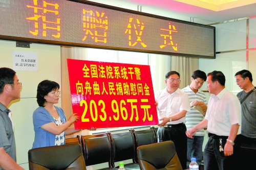 甘肃高院院长梁明远向舟曲抗灾救灾指挥部转交全国各地法院捐助的慰问金。马剑勇 摄