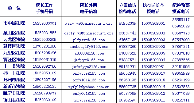 为进一步加强民意沟通,促进和谐司法环境建设,8月24日,徐州市中级法院召开新闻发布会,公布市中院和11个基层法院院长工作手机号码。