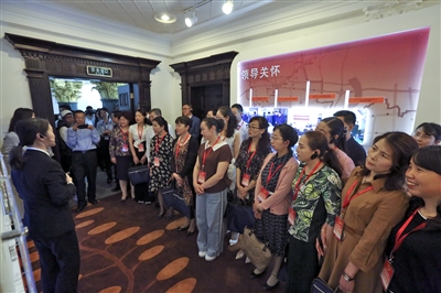 上海一中院法治文化长廊吸引了前来视察的代表们驻足观看。该院也是最高人民法院数字图书馆分馆的所在地,拥有种类齐全的中外法律文献资料。